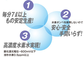 1.酸化還元電位-600mV以下、溶存水素量0.5ppm以上を実現。